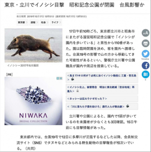 「昭和記念公園において、野生の猪が出没」とのこと。